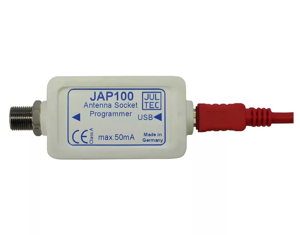 Der Programmieradapter Jultec JAP100 wird zum konfigurieren der programmierbaren Antennensteckdosen der Jultec JAP-Serie und zum konfigurieren der a²CSS-Einkabelumsetzer eingesetzt. Der Adapter stellt die Verbindung zwischen dem USB-Anschluss eines PCs oder Notebooks und dem zu konfigurierenden Gerät her. Der JAP100 meldet sich am Betriebssystem als "USB Seriell Port" an, der benötigte Treiber (FTDI VCP-Treiber) ist üblicherweise bereits im Betriebssystem vorhanden. Bitte beachten Sie, dass die Konfigurationsprogramme ein Microsoft-Betriebssystem ab Windows XP und eine Installation des .NET Framework ab Version 4.0 voraussetzen (ist ab Windows 7 standardmäßig vorhanden bzw. kann kostenlos von Microsoft heruntergeladen werden).Konfiguration der AntennensteckdosenDie für den jeweiligen Anschluss vorgesehenen Berechtigungen werden mittels der PC-Software "AnDoKon.exe" festgelegt und mit dem JAP100 in der Dose abgelegt. Ebenso können abgelegte Berechtigungen aus der Dose ausgelesen werden.Zu jeder Programmierung können Kommentare eingegeben werden, welche zusammen mit der Seriennnummer der Antennensteckdose in einer Klartext-Protokolldatei mitgeschrieben werden. Diese Datei kann mit jedem beliebigen Texteditor geöffnet werden.Ab der AnDoKon-Version R004 kann bei JAP-Dosen ab Software 25T03 der Fernspeisepfad dauerhaft eingeschaltet werden (dann verhält sich eine JAP wie eine diodenentkoppelte Antennendose) oder dauerhaft ausgeschaltet werden (dann verhält sich die JAP wie eine DC-getrennte Antennendose).Mit AnDoKon können auch einzelne Userbänder der a²CSS-Einkabelumsetzer gesperrt und freigegeben werden.Konfiguration der a²CSS-EinkabelumsetzerEinkabelumsetzer mit a²CSS-Technologie können optimal auf die Anforderungen des jeweiligen Verteilnetzes angepasst werden. Das Einspielen der jeweiligen Konfigurationsdatei erfolgt mittels der PC-Software "CSSkonfig".